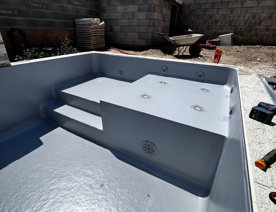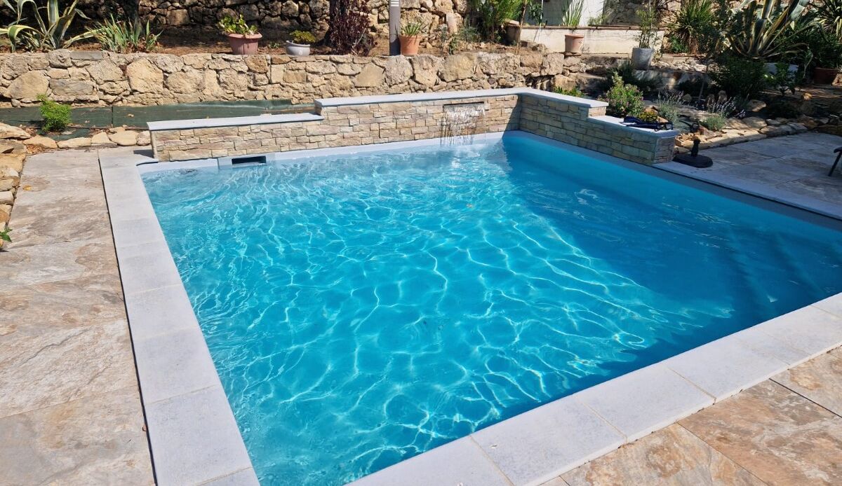 Construction piscine à Cazouls-lès-Béziers: 8x4 avec petit bain (1m10) et grand bain (1m60) - Banquette sur-mesure et intégration d'un mur fontaine